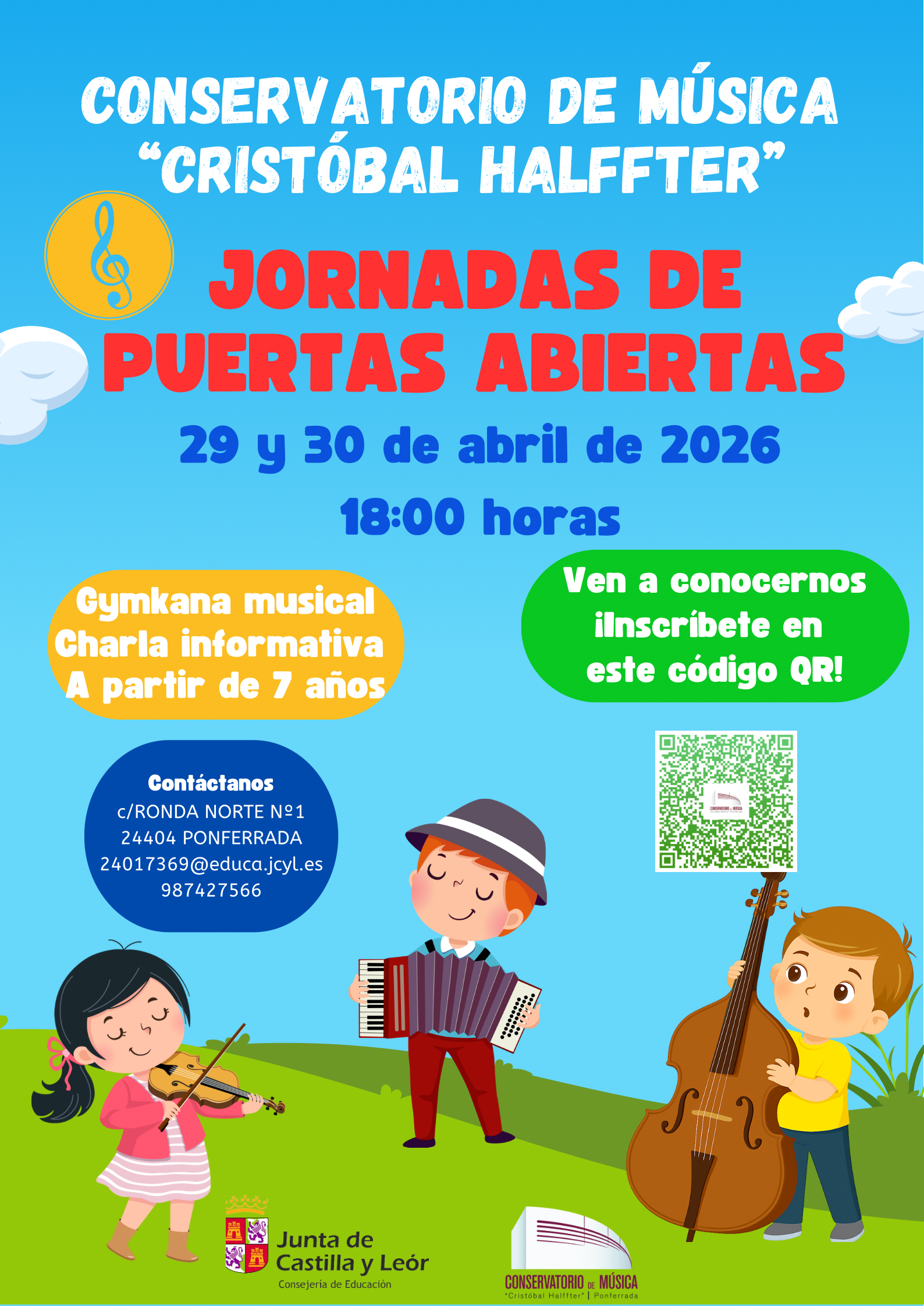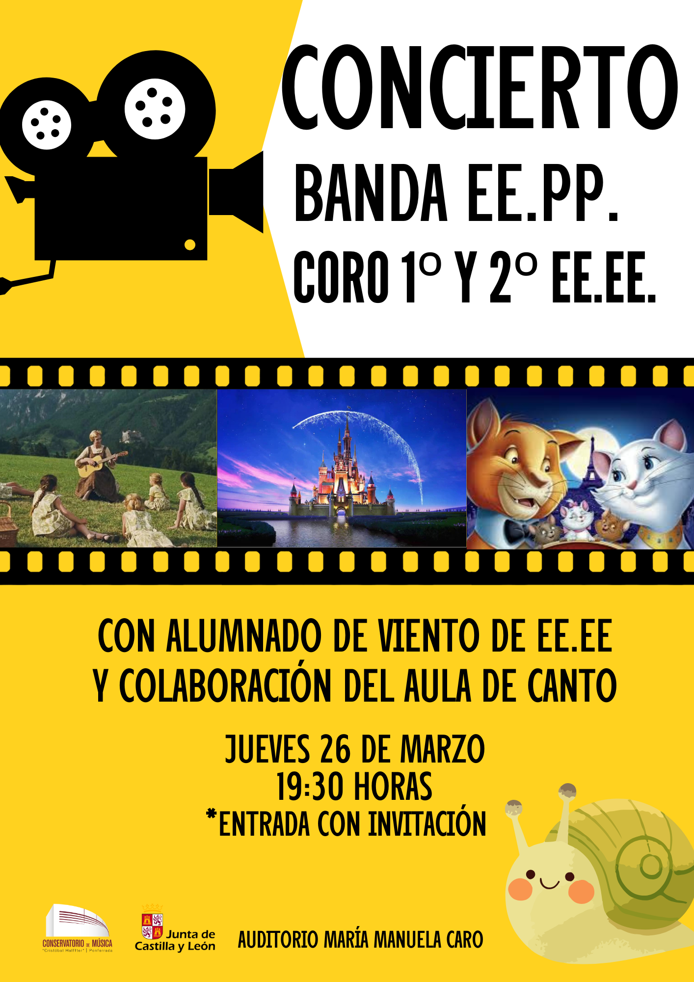 PRÓXIMAS ACTIVIDADES EN EL AUDITORIO CONCIERTO PROFESORADO 25-03-2026 CONCIERTO BANDA ENSEÑANZAS PROFESIONALES Y CORO 1º-2º ELEMENTALES 26-03-2026 CONCIERTO ENCUENTRO AGRUPACIONES EE.PP. CONSERVATORIOS DE LEÓN Y PONFERRADA 10-04-2026 |